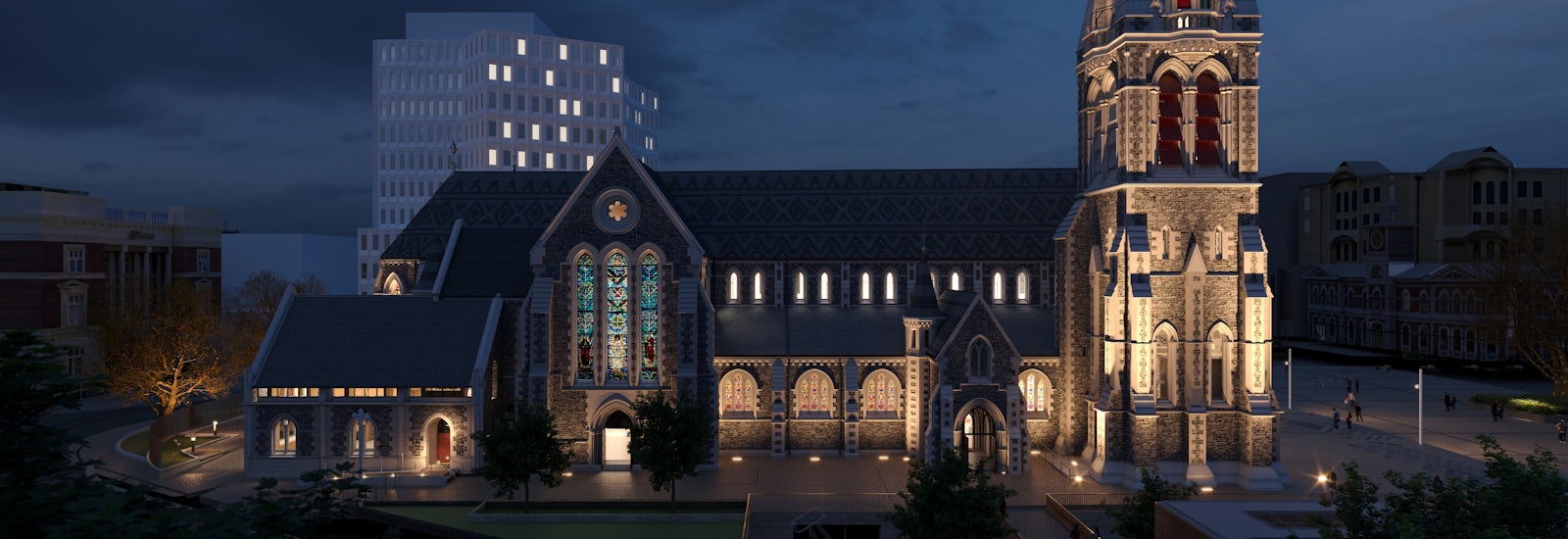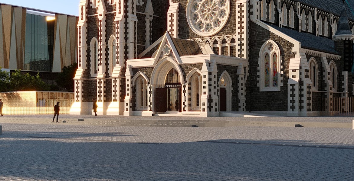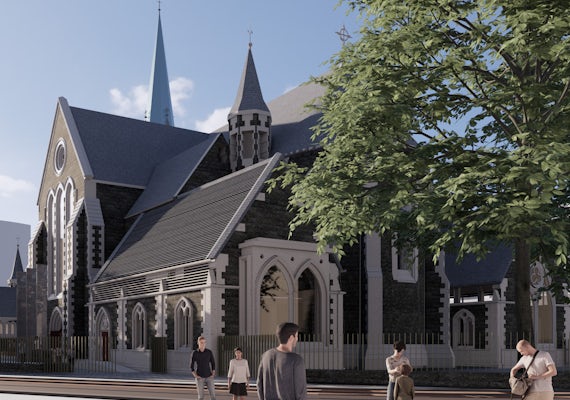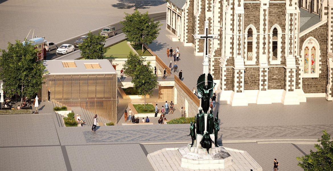 The new tower will be very similar in outward appearance to its predecessor but will be base isolated to achieve the required seismic standard. It will have a working belfry, with stairs and a lift providing access to the belfry, viewing platform and the lower courtyard to the north.