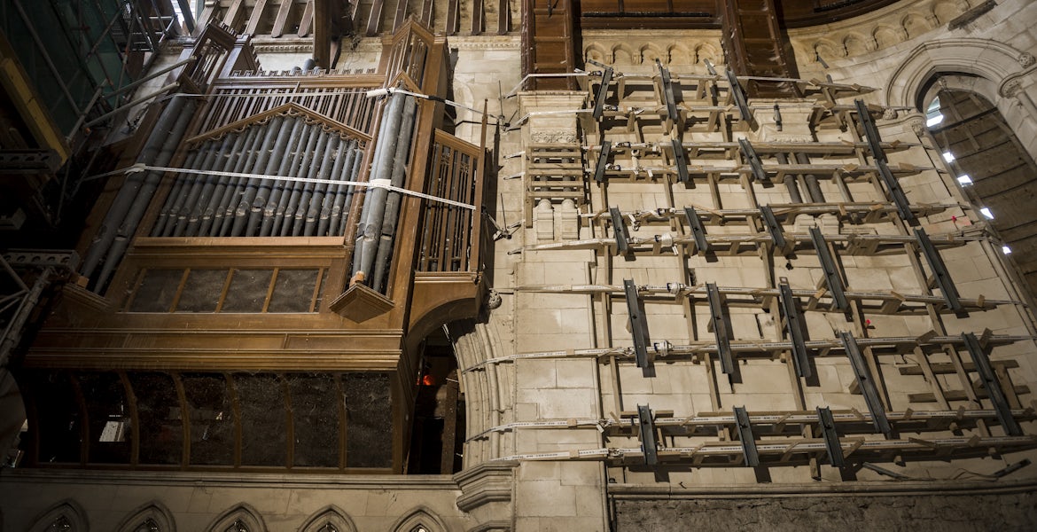 The final step in the stabilisation phase involves accessing the interior of the building for salvage and investigation works; retrieving heritage items, remaining stained-glass windows and organ, followed by decontamination and temporary weather protection.